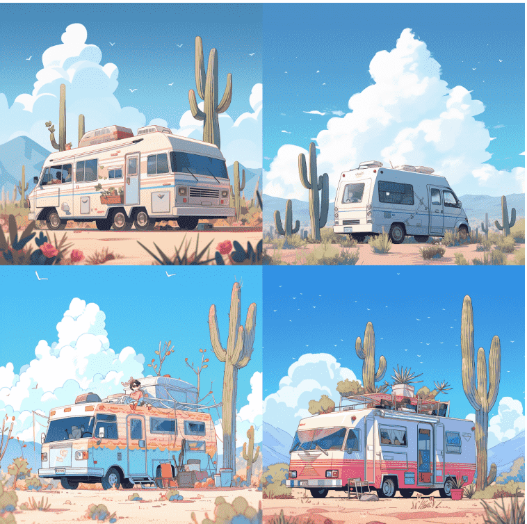 - 一对情侣开着房车去沙漠旅行,万里无云的蓝天,仙人掌;