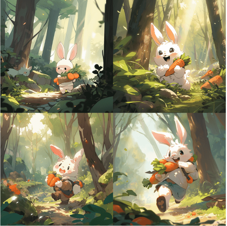 - 阳光明媚的春天,一只可爱的小兔子,抱着胡萝卜奔跑在森林里;