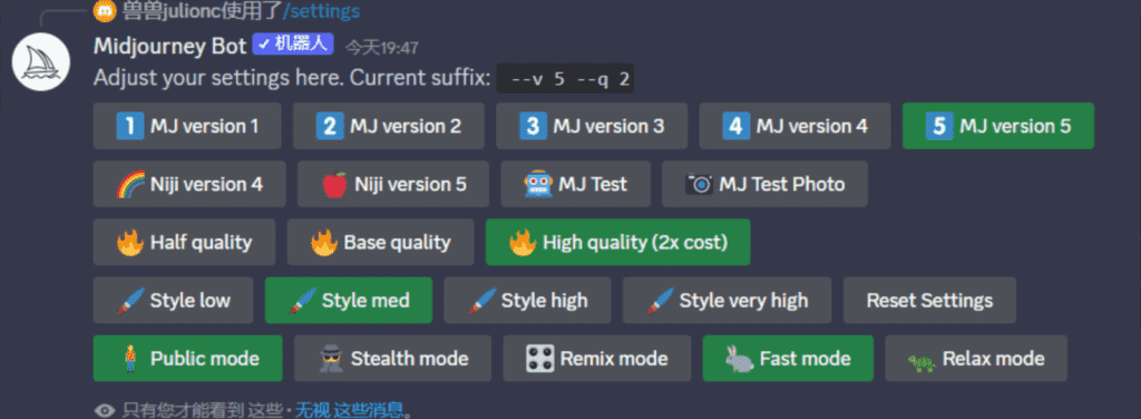 输入 /settings,可唤出设置菜单,可快速更换版本、质量、风格化等参数。