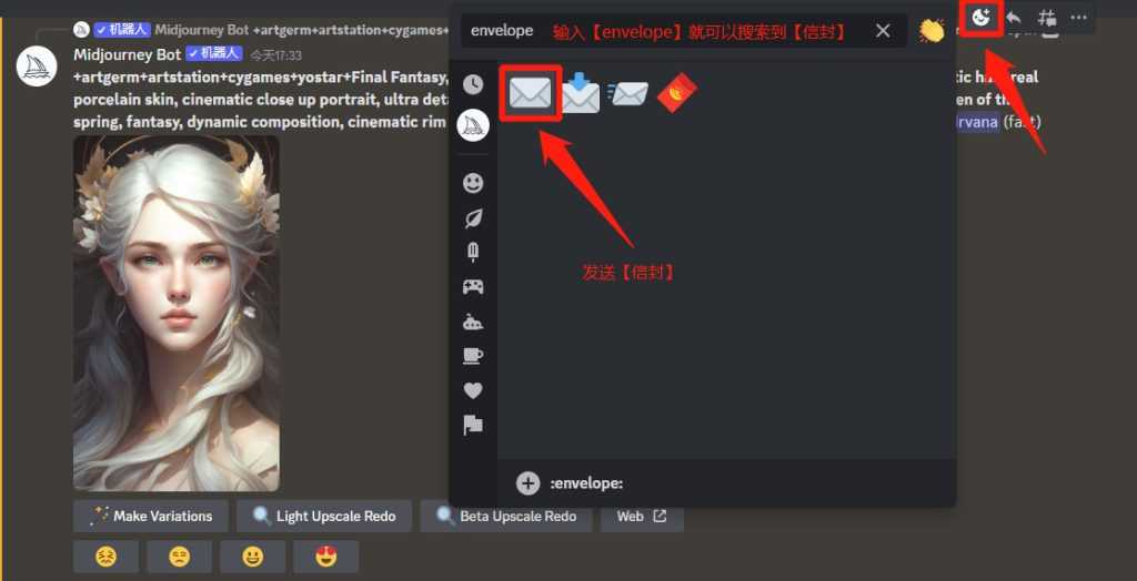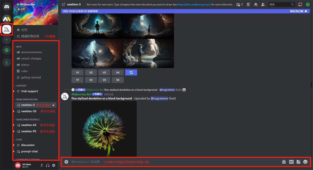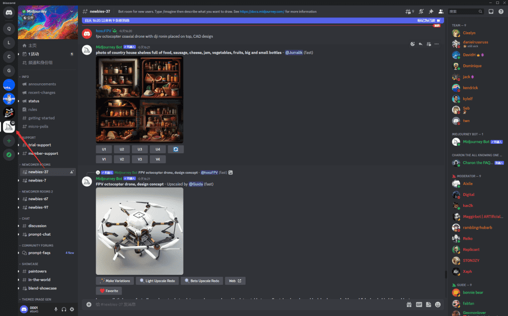 添加Midjourney bot机器人到你的服务器后,你可以在你的个人服务器上生成图片了 (在新手区生成图片很难找到自己生成的图片)