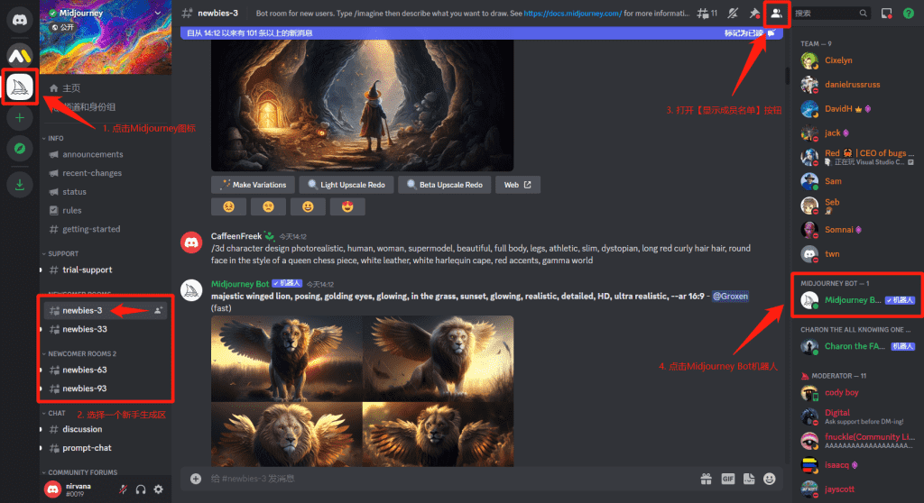 1. 进入Midjourney的[newbies-xxx]新手生成频道,点开右上角的[显示成员名单],点击[Midjourney bot机器人]