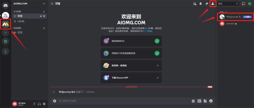 7. 进入你的服务器,在右侧[成员名单]中就可以看到[Midjourney bot机器人]