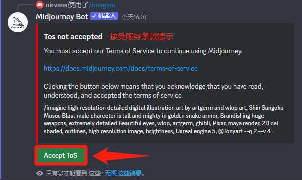 注:首次生成时候也许会出现这个提示,别紧张,这是[接受服务条款]提示,点击[Accept Tos]就可以了