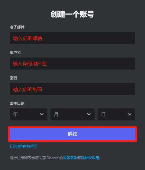 4. 输入你的[邮箱]、[用户名]、[密码]等账号信息,然后点击[继续]