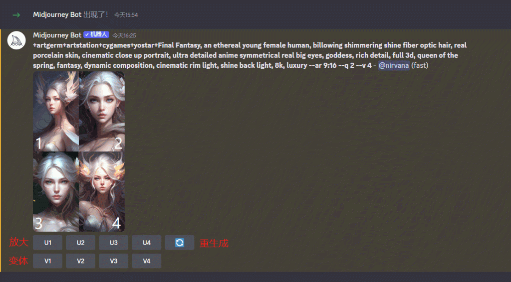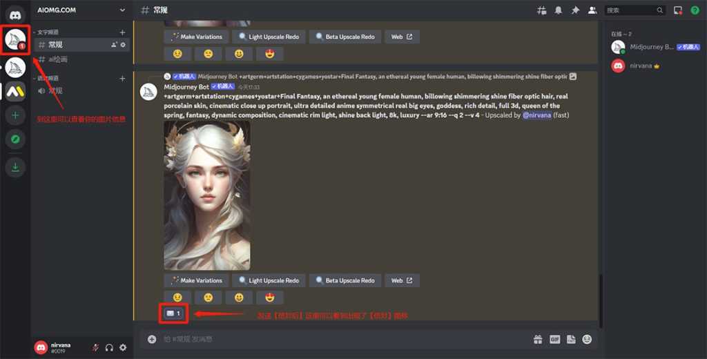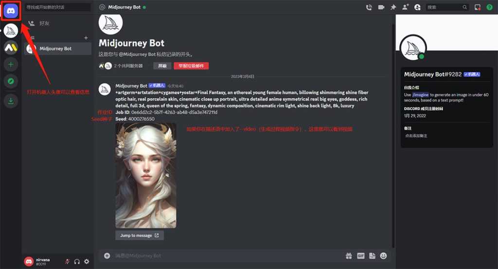 3. MJ会通过DM发送消息给你 (你也可以打开左侧栏第一个机器人头像,图片信息就在那里)