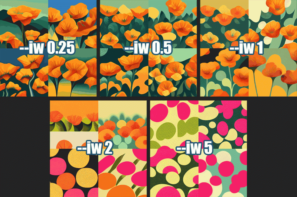 配合–iw指令可调整参考图和描述语的权重,默认值为0.25,最大值为5。数值越高对参考图的相似度越高,反之相似度越低。例如–iw 1会使你的参考图和描述语一样重要