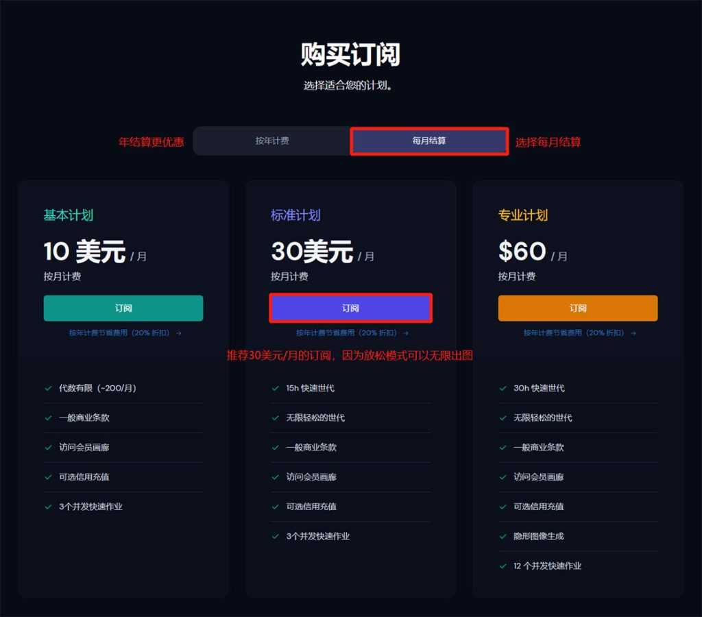 2. 选择[每月结算] (当然也可以下载按年计费,价格更优惠),然后选择[订阅计划] (推荐30美元/月的,因为Relax模式可以无限出图),选好后点击[订阅]按钮