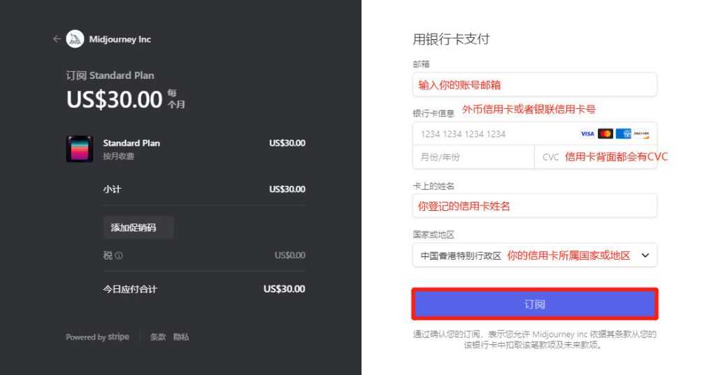 3. 输入你的信用卡相关信息,点击[订阅]即可开通会员