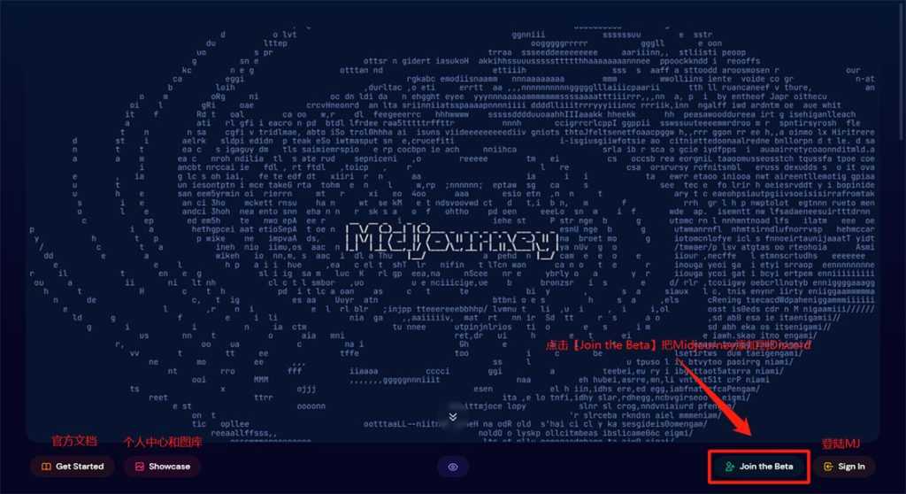 2. 进入Midjourney官网后,点击[Join the beta]按钮,可以自动将[Midjourney服务器]推荐到[discord]平台