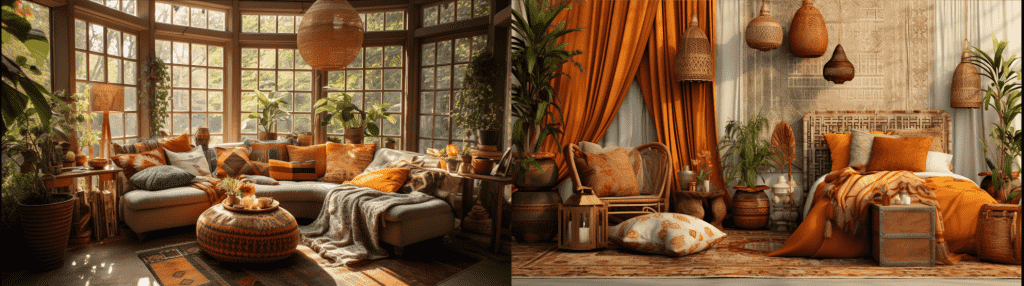 Boho interior design, white, olive green, cognac, mustard yellow, and rusty oranges colors room and lots of patterns such as florals and paisleys mixed with natural prints and geometric patterns are a hallmark of boho style, –ar 16:9 –v 5