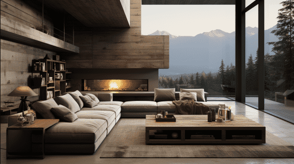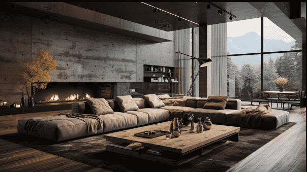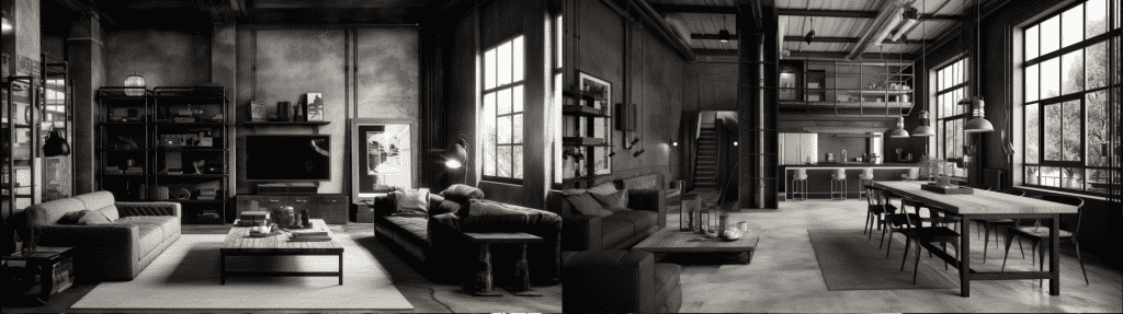 工业风格的室内设计,采用灰色、铁黑色和白色的单色调调色板,房间中使用原始粗糙的材料搭配现代元素。这种设计融合了新旧、回收再利用的材料,同时保持了简洁现代的外观。