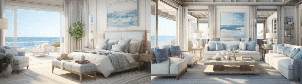 海滨风格的室内设计,房间强调蓝色、绿色、米色和白色等浅色调,以传达一种轻松的感觉,水面反射的光线营造出宁静的氛围