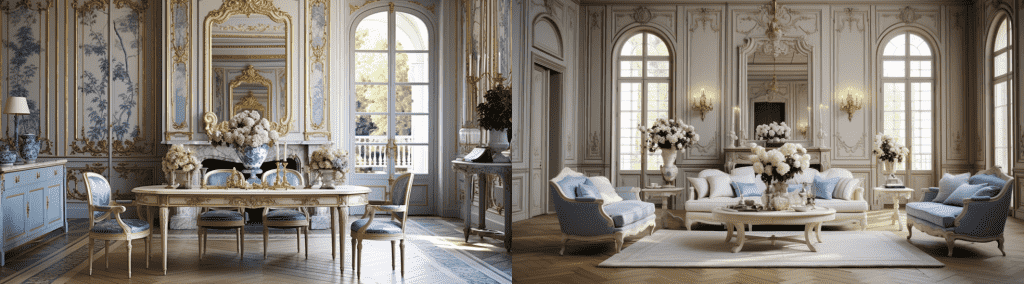 french Interior design, the room style are glossy ceramic granite or polished natural stone, parquet or laminate with light wood textures, Space, lots of light, bright colours and natural materials are the quintessence of French style, french painting –ar 16:9 –v 5.2