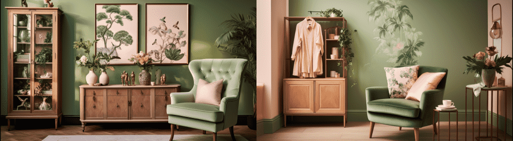 一个有淡粉色墙壁的更衣室,配有森林绿色的天鹅绒扶手椅、自然木材装饰和复古风格的植物印花。