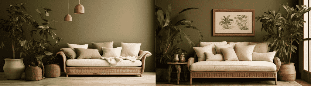 一间拥有土褐色墙壁的房间,配有柔和奶油色亚麻沙发、藤制装饰和柔和绿色的植物叶片。
