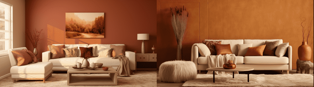 Earthy brown walls with a soft cream-colored linen sofa, rattan accents, and muted green foliage. –ar 16:9 –v 5.2