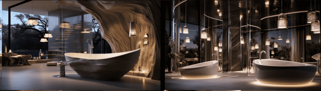 设计一个优雅而现代的浴室,带有未来主义的元素,融入有机材料和柔和的照明,受到菲利普·斯塔克(Philippe Starck)作品的影响