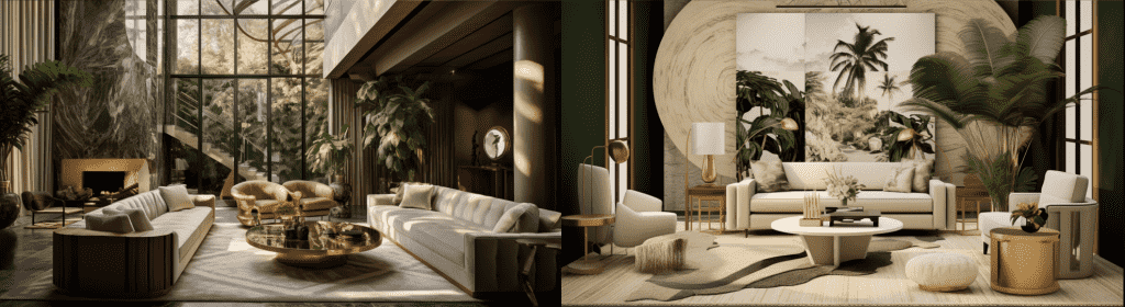 一个豪华的家居室内,融入生物亲和设计元素和自然色彩方案,灵感来自凯利·韦斯特勒(Kelly Wearstler)的作品。