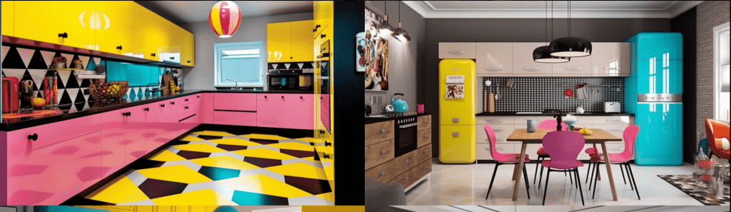 A cool pop-art inspired kitchen with bright, eye-catching appliances and retro furnishings –v 5 –ar 16:9