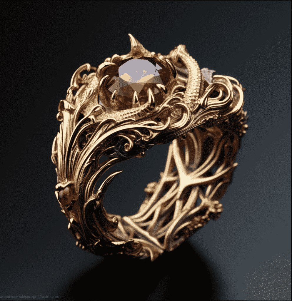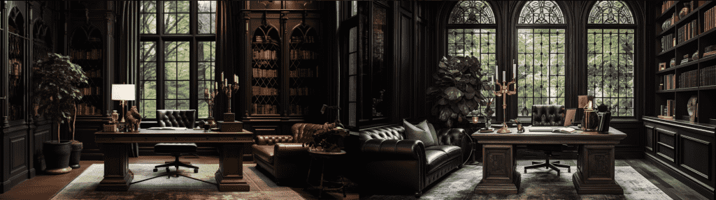 一个精致的哥特式风格家庭办公室,拥有深色木质镶板、戏剧性的照明和古董装饰。
