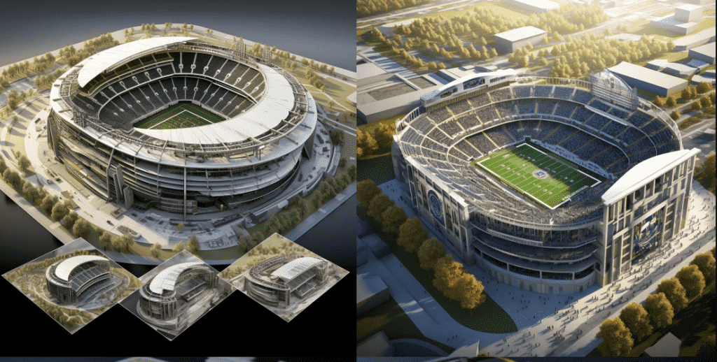 The three-dimensional renderings of the building, the stadium building plan, each space should have a corresponding layout –ar 1:1 –v 5