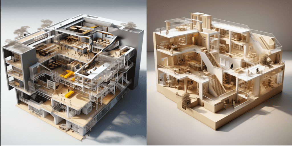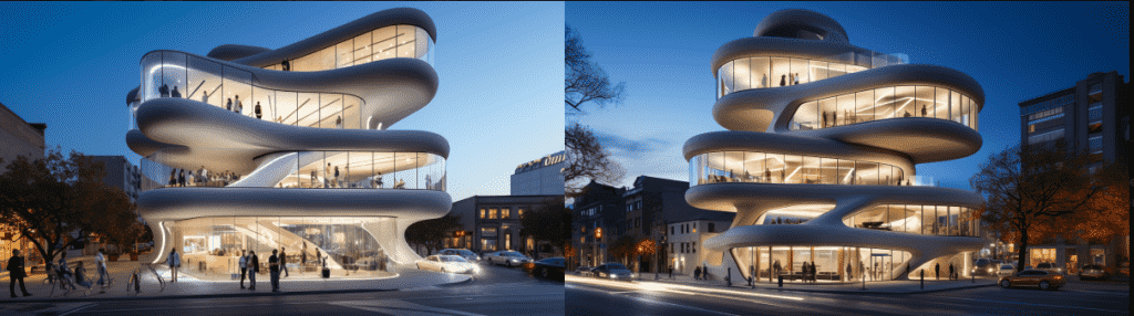 • 材料和色彩选择: 生成带有特定材料和颜色的图像,从而帮助建筑设计师更好地选择建筑材料和配色方案。