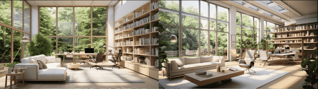 Interior Design, modernist, modern interior design, a perspective of of a study, large windows with natural light, light colors, plants, modern furniture –ar 16:9 –v 5.2