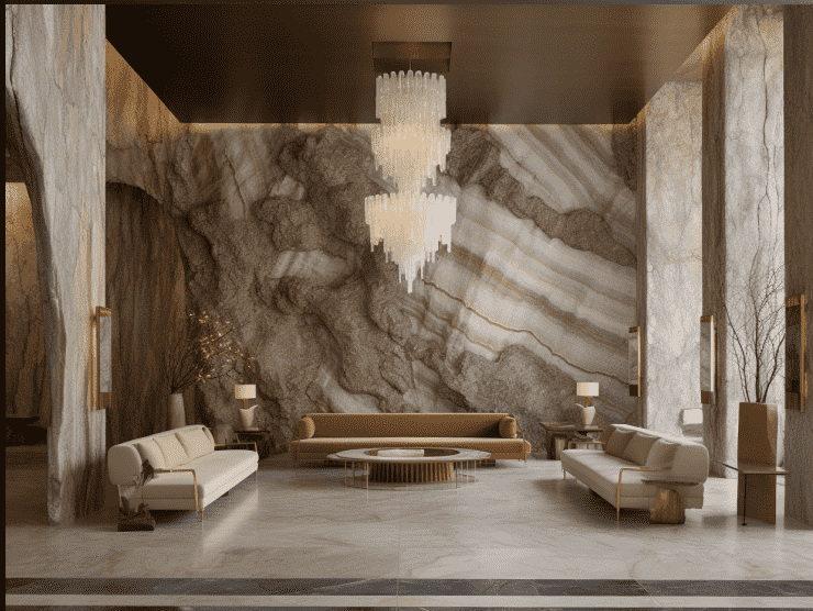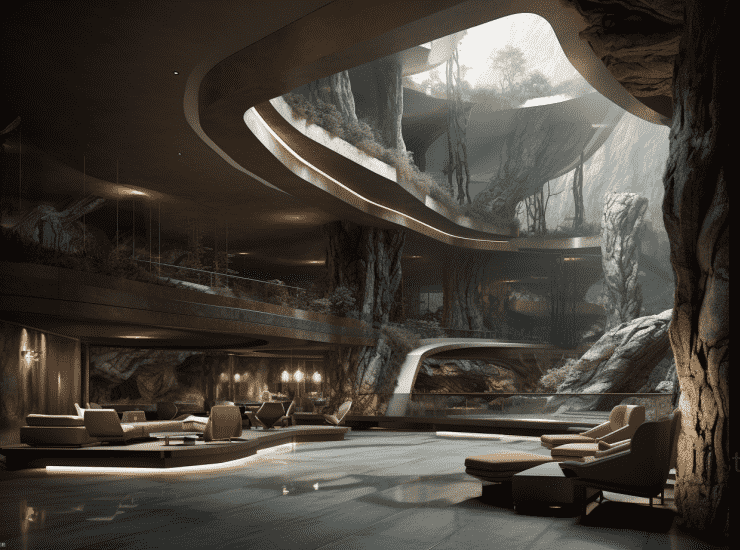a lobby in quarry concept and nature in between, Kelly Wearstler design –ar 4:3 –v 5.2