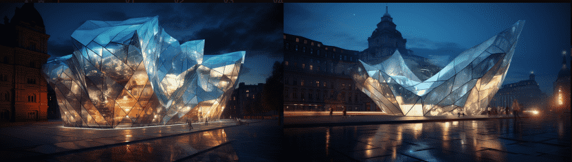 首先,材质可以直接影响建筑物的外观和风格。不同的材质具有不同的纹理、颜色、光泽度特征,可以营造出不同的视觉效果和风格。其次,材质也可以影响建筑物的性能和耐久度。不同的材质具有不同的物理、化学性质,对于建筑物的承重能力、耐久性、防水性、隔热性能也会有不同的影响。此外,材质的选择也会直接影响到建筑的成本和施工难度,在生成下面的图像时,笔者使用了 made of (由…..制作) 关键词,并在后面添加玻璃 Glass、不锈钢 Stainless steel、红砖 Red bricks 、哑光不锈钢 orrugated stainles stel、清水泥 Plain concrete等关键词