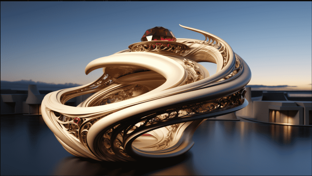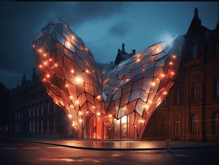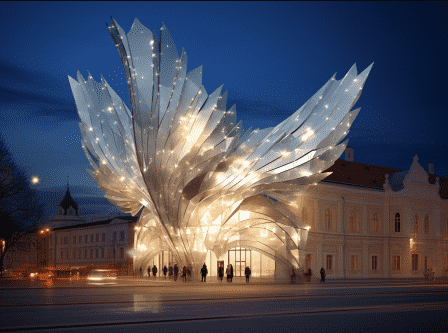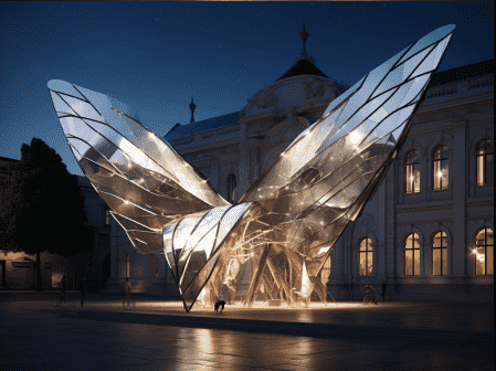 bulterfly building made of Glass, massive, epic, rococo architecture, Mobius, by Daniel libeskind, by Ferda Kolatan, volumetric lights –ar 16:9 –v 5.2