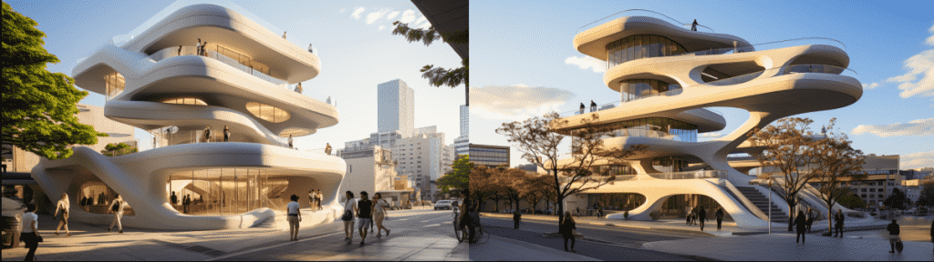 左图为参考图,右图提示语为 https://s.mj.run/L2kw9SImcO0 A white building , shot by canon eos R5,Space Extension and Space Staggering Architectural Design Techniqgues. curved exterior photorealistic –ar 16:9 –s 500 –v 5.2