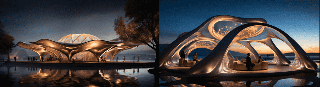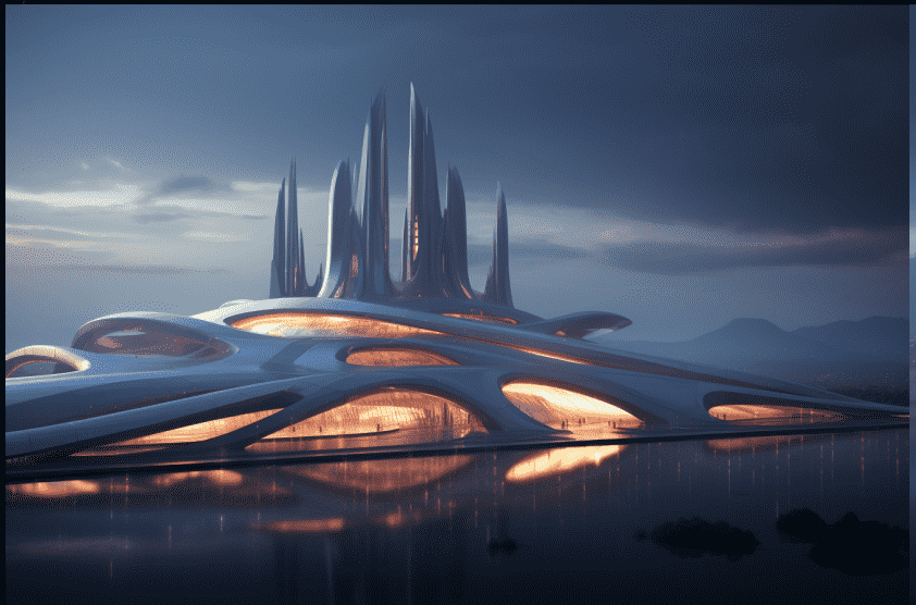 (右图为参考图)https://s.mj.run/rdO1OIoxaK8 A Complex curve-shaped scientific and technological buildings, futuristic, curve-based buildings, epic sci-fi scenes, masterpieces, octane render ,atmospheric, volumetric lights, Cinematic, delicate, unreal engine 5, by Zaha Hadid, atmospheric, long exposure –ar 3:2 –v 5.2