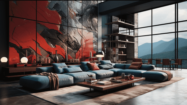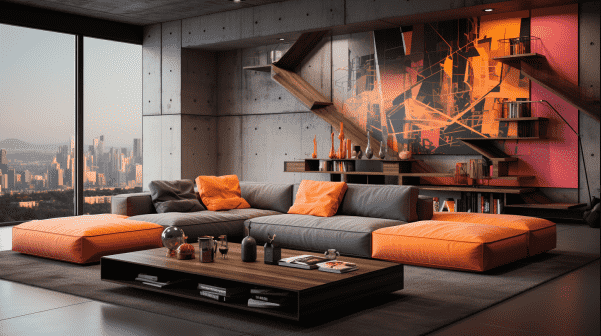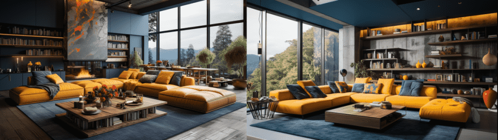 living room ultra modern design with yellow and blue color scheme ,a modern interior gray walls concrete luxurious penthouse, architectural, wood design furniture –ar 16:9 –s 500 –v 5.2