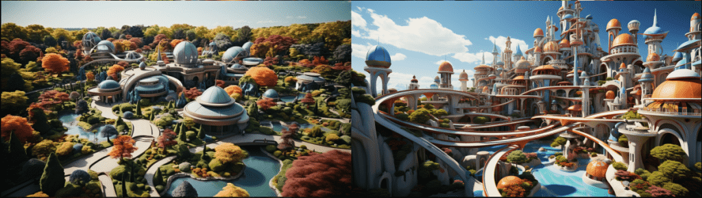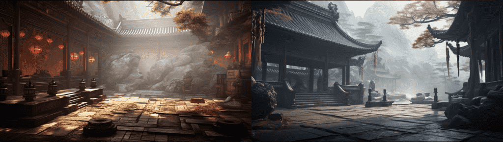 利用Mj也可以轻松生成中式园林、寺庙类场景,例如,下面的两组图像是笔者分别以Song dynasty architecture ( 宋代建筑)、Tang dynasty architecture( 唐代建筑)为关键词,辅以对环境的简单描述生成的效果。