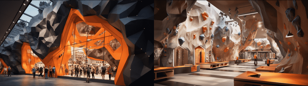 sports gear superstore with rock climbing wall, Nike store, kayaking, camping gear, rustic, warm environment, modern architecture, futuristic, Zaha Hadid Design –v 5.2 –ar 16:9