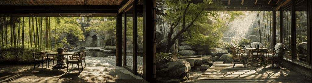 In a bamboo grove garden during the afternoon, Song dynasty architecture, garden-style design, stone and wood materials, weathered texture, dappled light through leaves, muted earthy colors, ground-level view, rattan furniture –ar 16:9 –v 5.2