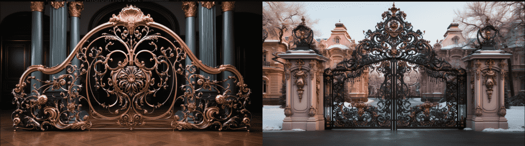 old wrought iron gates design, forged decorative elements, in Rococo style, made of copper material and are double door –ar 16:9 –s 800 –v 5.2