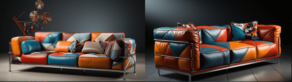 A modern and stylish sofa design with cowhide material, featuring blue and red color blocks in a collage style, metal armrests, and four curved corners, design by Charles and Ray Eames –ar 16:9 –s 800 –v 5.2