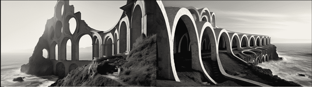 spiraling massive gothic monolothic structure with arches on a cliff, crashing waves and a sky tinged with the sun, hellenic, designed by Hidetaka Miyazaki, photography by Hélène Binet –ar 16:9 –c 3 –v 5.2