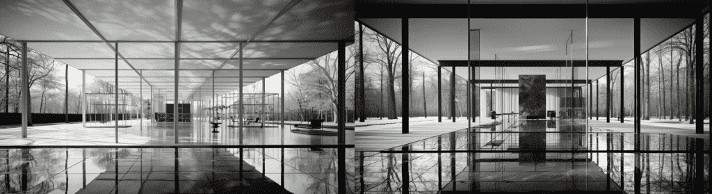 Ludwig Mies van der Rohe, house with glass and mirrors and grid columns, light and modern and transcendent, photographed by Ezra Stoller –ar 16:9 –c 2 –s 90 –v 5.2