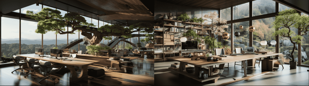 Interior design a concept office, it has Chinese style and natural atmosphere , Wooden furniture and decoration –ar 16:9 –s 850 –v 5.2