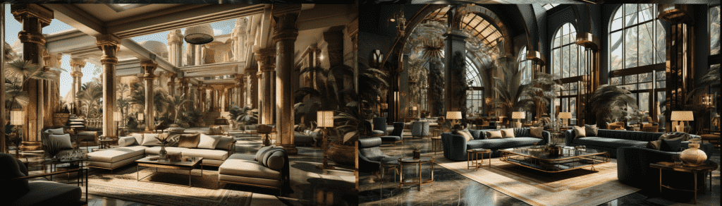 使用Mj除了可以创建前面所讲述的各种建筑室内外方案,还可以设计建筑室内外经常用到的空外建筑雕塑、家具、灯具、门、窗帘、地琐和壁纸等的方案。