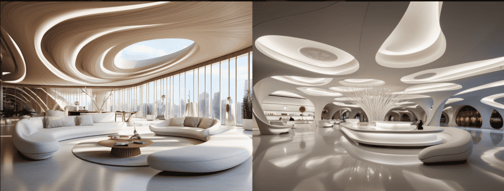 The ceiling is modern with impressive curves in Zaha Hadid style –ar 4:3 –v 5.2