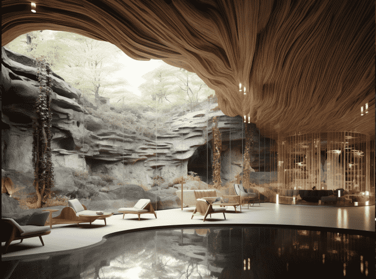 a lobby in quarry concept and nature in between, Kengo kuma design –ar 4:3 –v 5.2