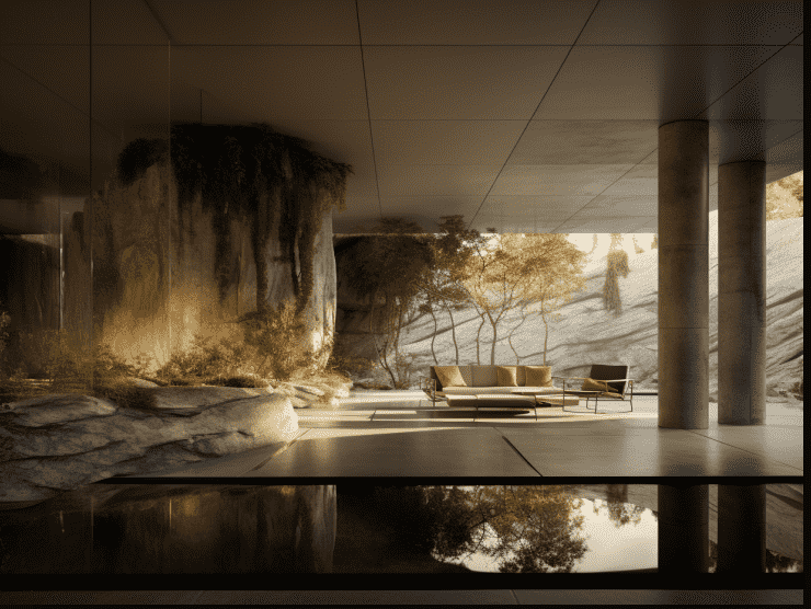 a lobby in quarry concept and nature in between, David Chipperfield design –ar 4:3 –v 5.2