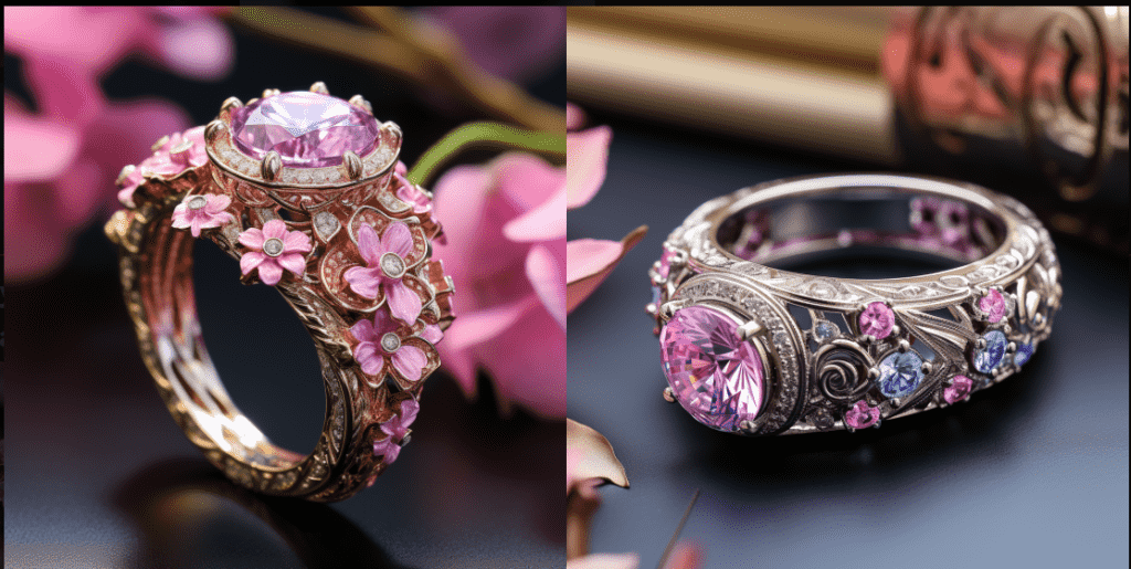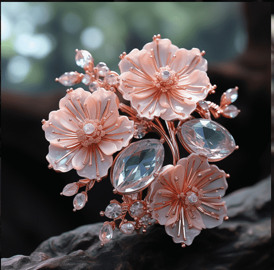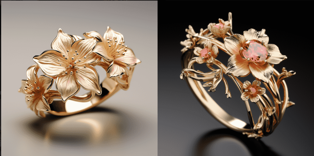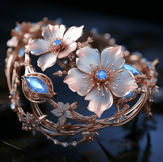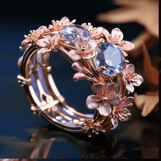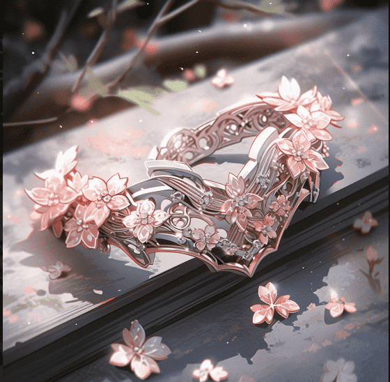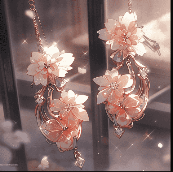 a jewelry design, sakura-themed {earings, rings, nacklace}, gemstones and diamonds, luxury, Frank Gehry style,closeup, product view, trending on artstation, cgsociety, ultra quality, digital art, exquisite hyper details, 4k, Soft illumination, dreamy, fashion, rendering by unreal engine –s 550 –v 5.2