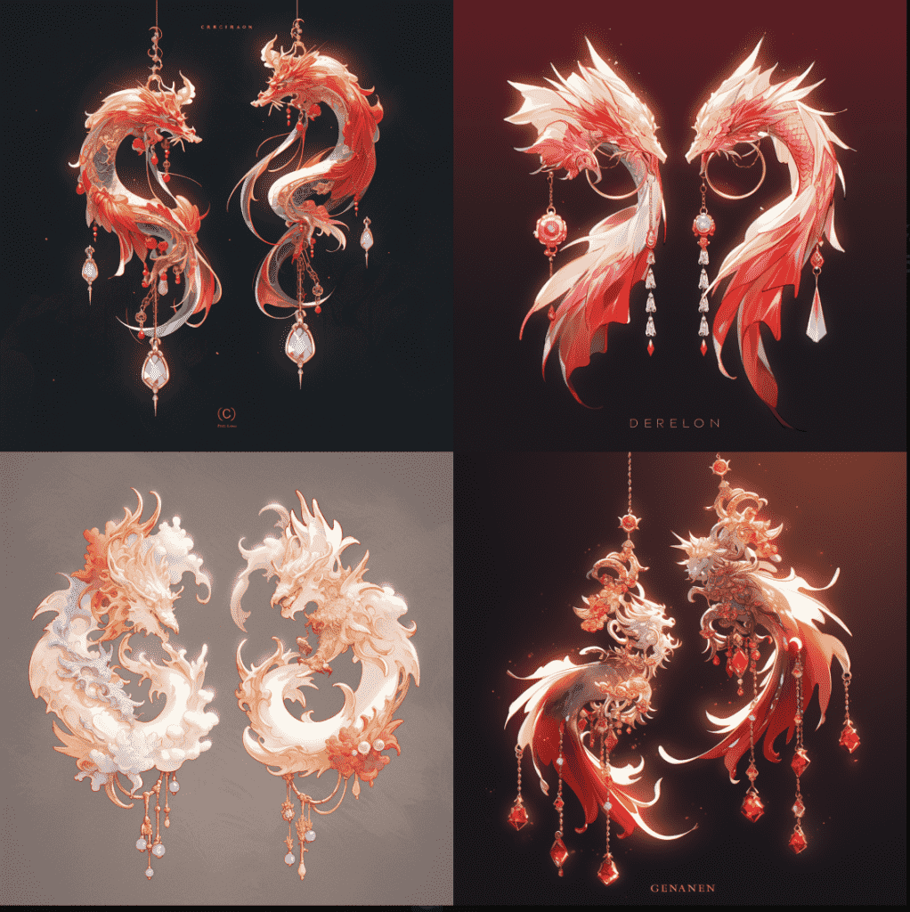 Earring jewelry design , Chinese style,The jewelry shape is inspired by the minimalist style of dragon and phoenixel ements, shot by canon eos R5, Delicate, elegant, detailedintricate,photorealistic , product view, –s 150 –v 5.2