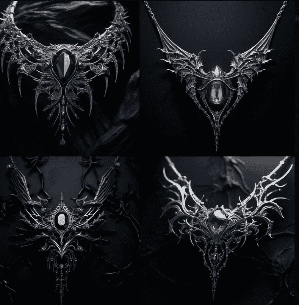 jewelry design,necklace design,in style of H.R. Giger gemstones and diamonds,luxury, shot by canon eos R5, Delicate, elegant, detailed intricate,photorealistic, product view,–s 150 –v 5.2