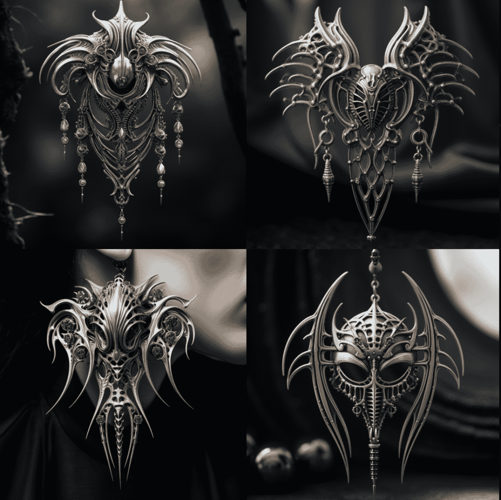 Earring jewelry design, H.R.Giger style, shot by canon eos R5, Delicate, elegant, detailed intricate, photorealistic, product view –s 150 –v 5.2