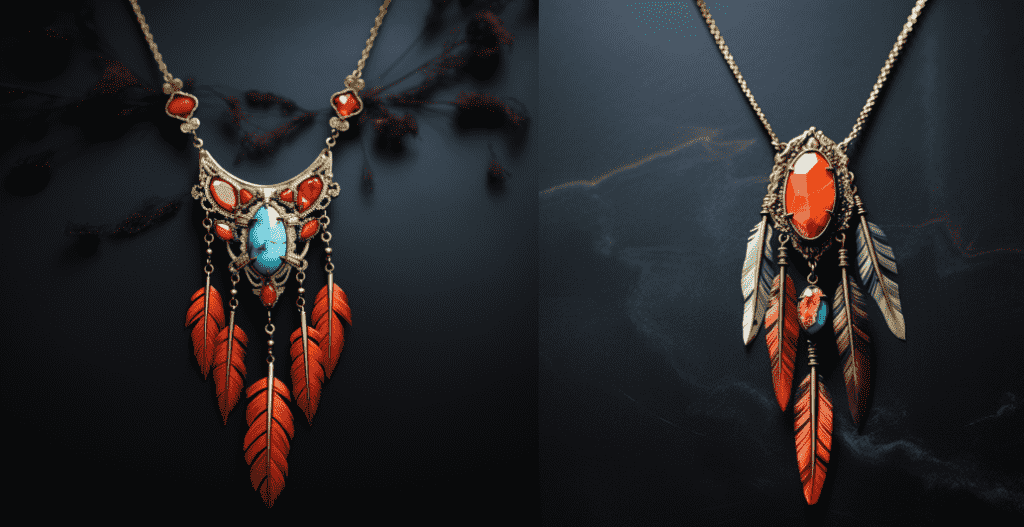 necklace design,jewelry design , Native American style Incorporate feathers, Indian totems and coral elements gemstone centerpiece, vibrant stone, delicate and sturdy gold chain, sparkling gemstone accents, simple yet eye-catching design –s 150 –v 5.2